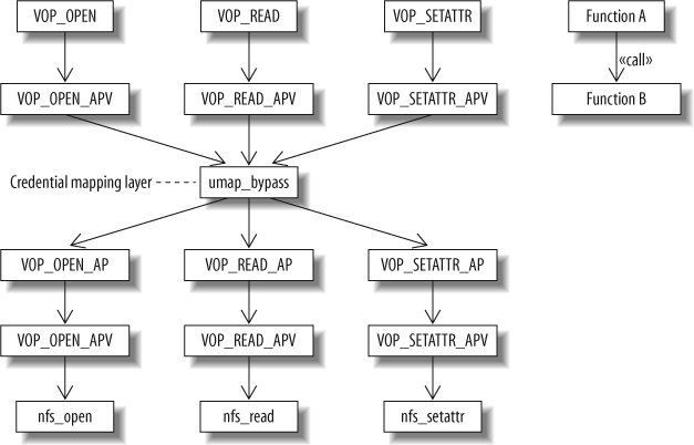 As you can see back in Figure 17-1, “Layers of indirection in the FreeBSD implementation of the read system call”, the processing of the read system call doesn't start from VOP_READ. VOP_READ is actually called from vn_read, which itself is called through a function pointer.