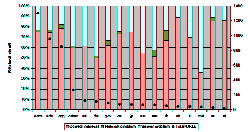 In Figure 5 we list the retrieval result of the referenced URLs according to their top-level domain. The domains .com, .edu and .org represent 74% of all referenced URLs. Other studies [7] have estimated that on a global scale only 6% of the Web servers have scientific or educational content. Since in our sample URLs in the .edu domain form 23% of the total we can deduce that these URLs are referenced three times more frequently than what would be expected by their population. It is interesting to note that URLs in the .com and .edu domains are equally likely to fail; a startling result given the radically different management models prevalent in educational establishments and companies. Also remarkable is the fact that URLs in the .org domain are less likely to fail than the other two categories; contrary to intuition, it appears that the management structures used by the ad-hoc volunteer efforts typically hosted in .org domains result in more stable Web sites.