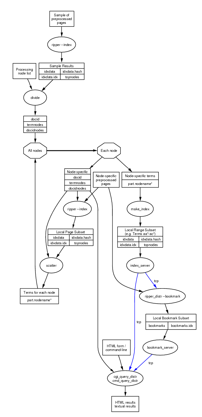 To divide the term load across the nodes, we run a stand-alone instance of ripper --index on a small representative subset of documents. A separate text file contains a list of all processing nodes. The program divide: