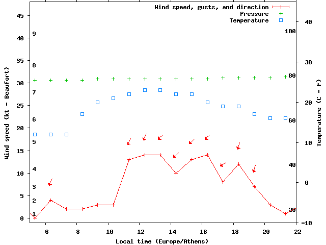 Dawn after 5:00; dusk before 22:00 local time (Europe/Athens).