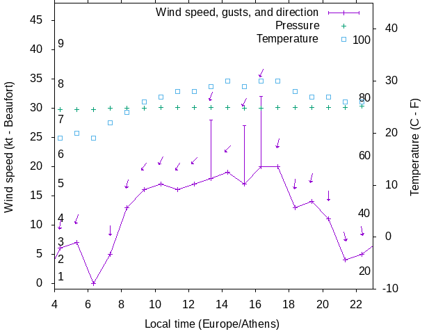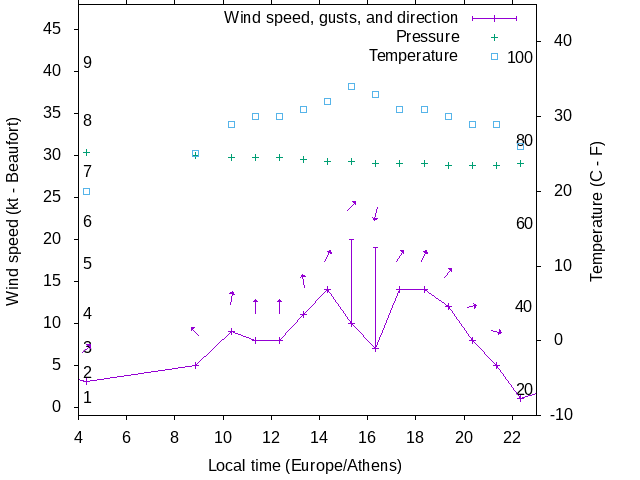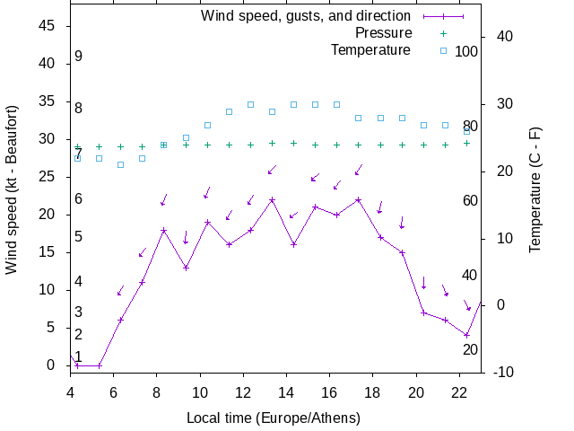 Dawn after 4:00; dusk before 23:00 local time (Europe/Athens).