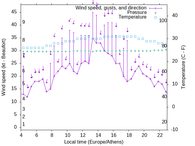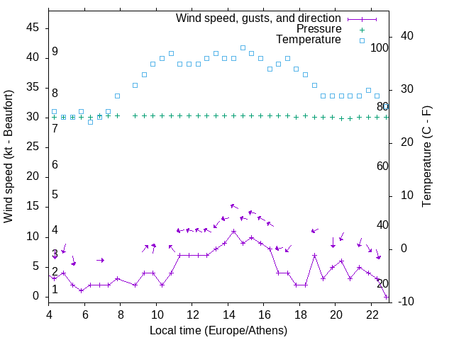 Dawn after 4:00; dusk before 23:00 local time (Europe/Athens).