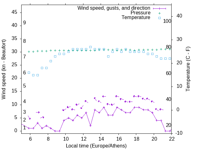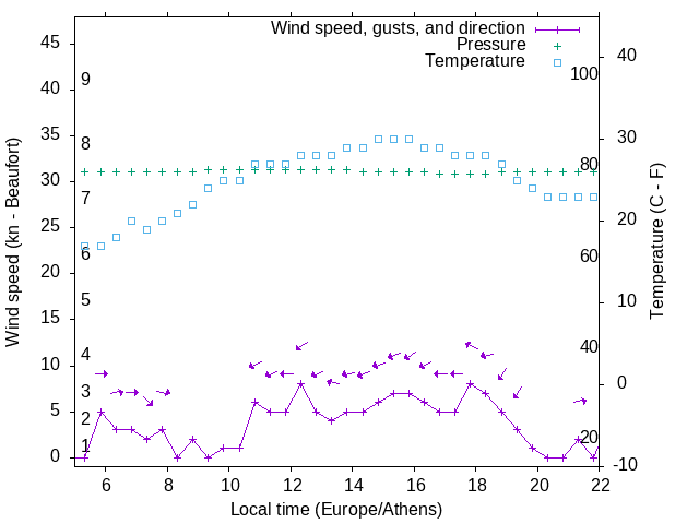 Dawn after 5:00; dusk before 22:00 local time (Europe/Athens).