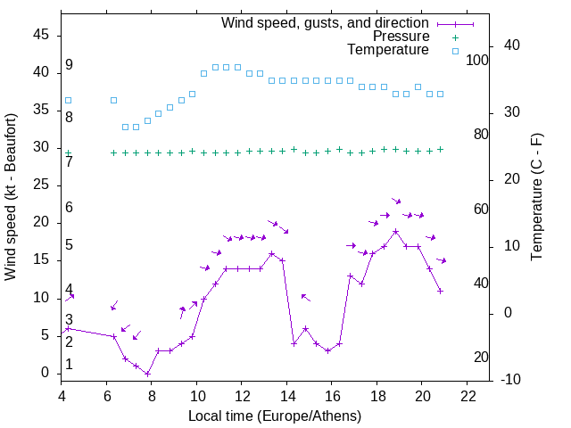 Dawn after 4:00; dusk before 23:00 local time (Europe/Athens).