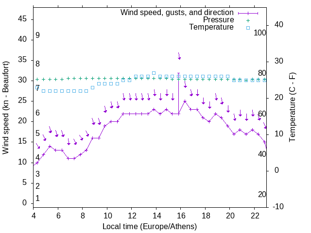 Dawn after 4:00; dusk before 23:00 local time (Europe/Athens).