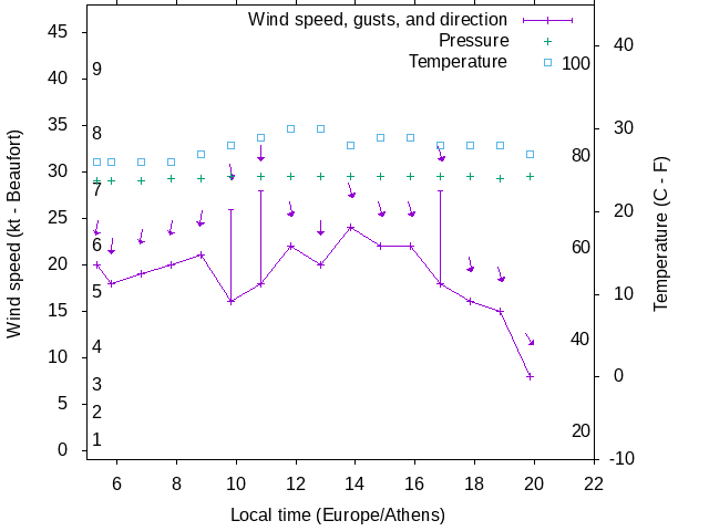 Dawn after 5:00; dusk before 22:00 local time (Europe/Athens).
