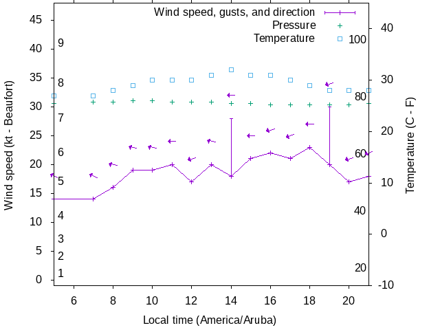 Dawn after 5:00; dusk before 21:00 local time (America/Aruba).